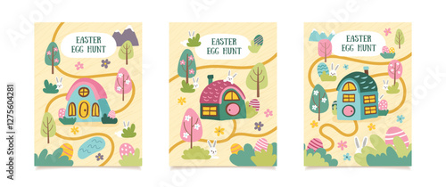 Fototapeta premium Set of Easter egg hunt greeting cards. Easter backgrounds with house, road,...