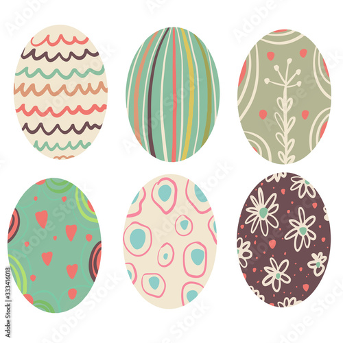 Fototapeta premium Set of easter eggs with a pattern on an isolated white background. Delicate, cute color palette. Happy easter. Greeting card design element and more. Digital hand drawing illustration.