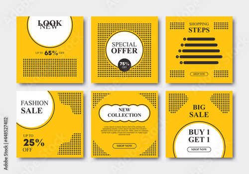 © ngupakarti, Fototapeta premium Set of editable minimal square banner template. Yellow, white and black colors for social media post. Suitable for social media post, brochure, flyer, web, internet ad, etc. Vector illustration