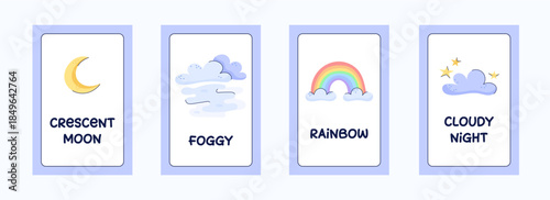 © plaksik13, Obraz premium Set of educational weather cards for kids. Postcards with captions. Weather icons crescent Moon, Foggy, rainbow and cloudy night. Cute hand drawn vector illustration.