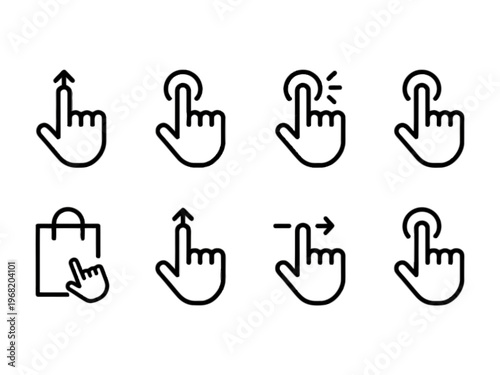 Obraz premium Set of eight minimalist line art touch gesture icons representing user interface interactions and digital navigation controls on transparent background