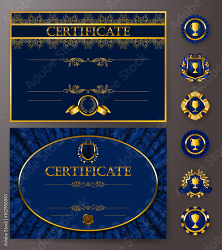 Naklejka premium Set of elegant templates of diploma with lace ornament, ribbon, wax seal, badges, place for text. Certificate of achievement, education, awards, winner. Vector illustration EPS 10.