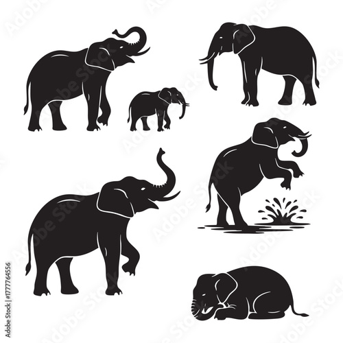 © tarakacraft, Naklejka premium Set of Elephant Silhouettes Rearing and Walking Vector Illustration
