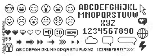 Obraz premium Set of emoji, globe, specch bubbles, arrows and alphabet. Pixel art vector...