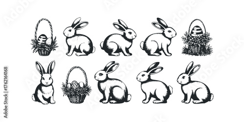 Naklejka premium Set of Engraved Easter Bunnies and Baskets with Eggs