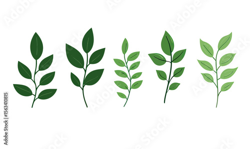 Fototapeta premium Set of five green leaf branch icons with varying shades of green in flat minimalist vector style isolated on white background