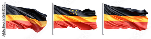 © Daniel, Fototapeta premium Set of flags of Germany. Germany symbols design elements. Large German flag waving in the wind. Isolated on a transparent background.