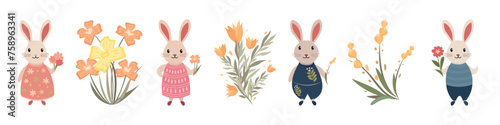 Obraz premium Set of flat children's illustrations of rabbits with plant elements 2