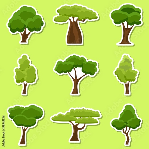 © photoplotnikov, Fototapeta premium Set of flat stylized Tree stickers. Cartoon garden green tree icons. Nature environment organic forest and park. Spring or summer trees stickers. Vector illustration