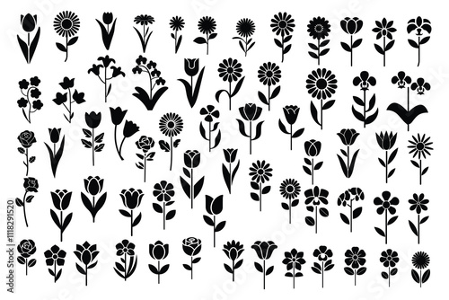 © DesignAlchemy 207, Naklejka premium Set of Flower icons Silhouettes, Abstract botanical flower icon, vector botany floral design Cute round flower plant nature collection, Vector illustrator.