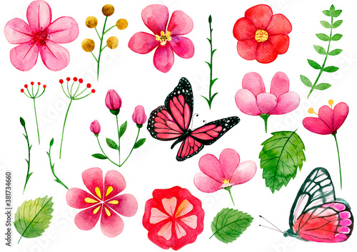 Obraz premium set of flowers, Pink watercolor flowers, pink butterflies, watercolor clipart on a white background,