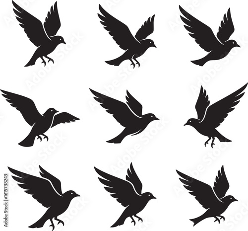 Obraz premium Set of Flying Bird Silhouettes – Black and White Vector Illustration