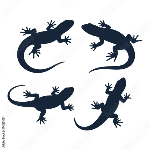 © Juma, Naklejka premium Set of four black silhouettes of geckos in dynamic poses for decorative and educational purposes silhouette
