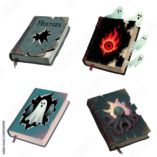 © Evgenia, Obraz premium Set of four horror books with torn covers — creepy octopus, ghosts, burning eye, haunted theme, isolated on transparent background