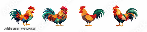 Fototapeta premium Set of four roosters in different poses isolated on a white background. Concept of farm animals, vibrant feathers, rooster designs, chicken farming, cute birds. Print, icon, design element