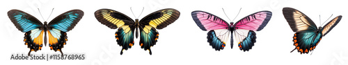 Fototapeta premium Set of four tropical butterflies featuring vibrant colors and detailed wing patterns, isolated on a white background for clarity