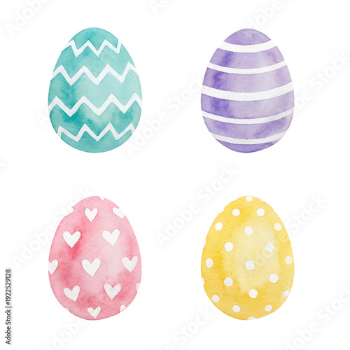© Ekaterina, Fototapeta premium Set of four watercolor decorative Easter eggs with various patterns on transparent background for spring holiday card, for greeting invitations and crafts.