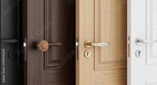 © Heri, Fototapeta premium Set of Four Wooden Doors with Different Stylish Handles in Neutral Tones