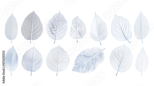 Obraz premium Set of frosted winter white leaves with intricate veins isolated on transparent background