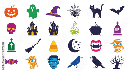 © Narmada, Fototapeta premium Set of Fun and Colorful Halloween Icons, Silhouette Pumpkins, Skeletons, Ghosts, and Spooky Symbols on White Background, Vector Illustration Pack for Party and Holiday