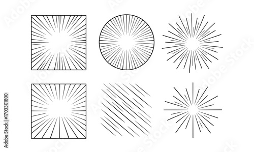 Fototapeta premium Set of geometric sunburst patterns with lines and rays in black and white