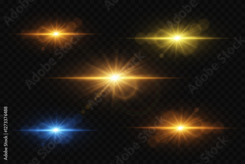Fototapeta premium Set of glowing light effects. Shining stars, glare, explosion, sparkle, dust, lines, flash of spark.