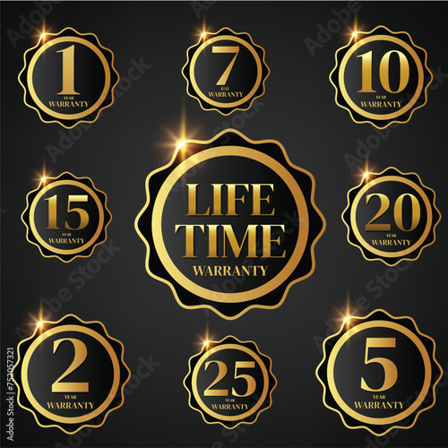 Naklejka premium set of golden warranty logo,Vector golden warranty number. 1, 2,7,, 5, 10, 15,,20 ,25,,life time,logo design. vector illustration