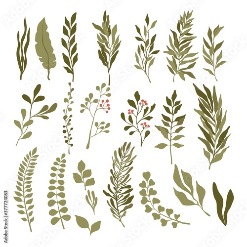© Pavlo Plakhotia, Naklejka premium Set of green leaves and branches isolated on white background. Green and fresh summer foliage for the wreath, border, wallpaper design. Elements for wedding, greeting, birthday decoration.