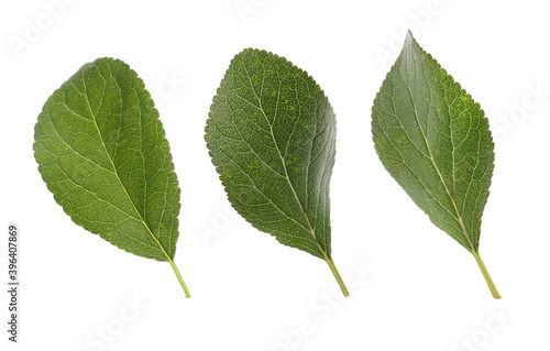 © New Africa, Obraz premium Set of green plum leaves on white background