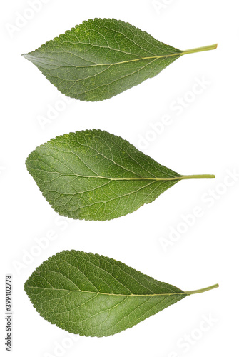 © New Africa, Naklejka premium Set of green plum leaves on white background