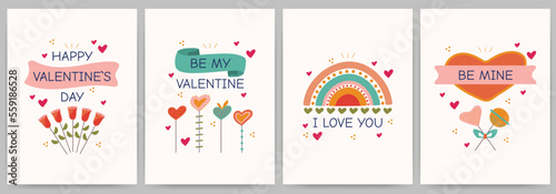 © Inna, Naklejka premium Set of greeting cards Happy Valentine's Day, invitations, declaration of love. Rectangular templates with candies, hearts, ribbons, roses, rainbow. Vector illustration with text.