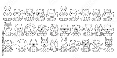 © titaporn, Fototapeta premium Set of Groovy Woodland Animal Collection Vector, Hand Drawn Bear Rabbit Skunk Racoon Squirrel Bear Deer Hedgehog Owl and Tiger Outline.