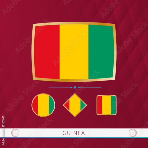 Fototapeta premium Set of Guinea flags with gold frame for use at sporting events on a burgundy abstract background.