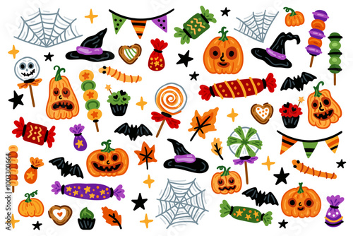 © Pictulandra, Naklejka premium Set of Halloween characters pumpkin and sweets with trick or treat candies. Many types spooky dessert.