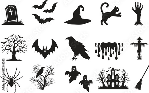 © SAGOR, Naklejka premium set of halloween element silhouette collection. Black and white vector editable file. Bat, black cat, Black Witch Hat, Broomstick, crow on brunch of tree, fierce bat, ghost figures, vector, grave, hau