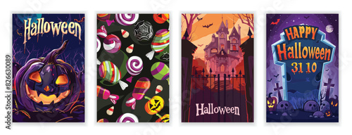 Obraz premium Set of 4 Halloween Party Poster Set with Spooky Mansion, Graveyard, Candies, and Pumpkins. Horror Night Art Covers for October 31 Holiday Evening Promotions. Typography and Illustrations for EPS Print