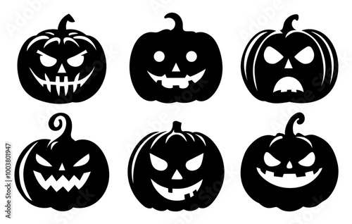 Fototapeta premium Set of Halloween Pumpkin black silhouettes isolated on transparent background, Scary Spooky Carving Pumpkins.