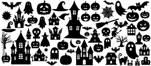 Naklejka premium Set of Halloween Silhouettes – Haunted Houses, Pumpkins, Ghosts, Witches,...