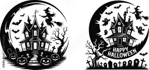 Fototapeta premium Set of Halloween t-shirt designs with haunted house, witch, spooky ghosts, full moon, pumpkins, bats, scary tree with night vibe and Halloween elements vector illustration on black background.