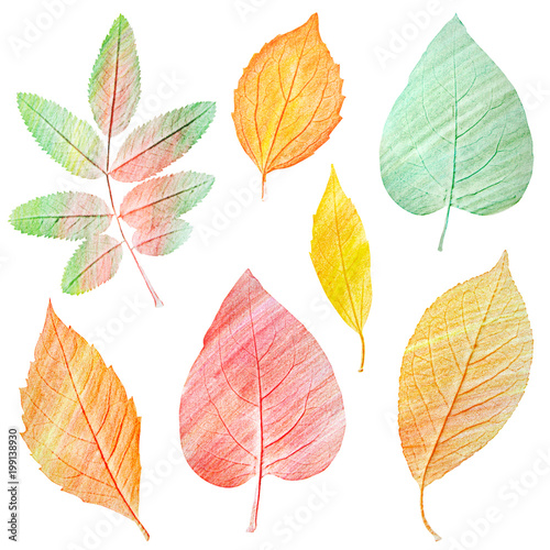 Fototapeta premium Set of hand draw green and golden yellow leaves on white background