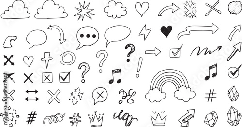 Fototapeta premium Set of hand-drawn doodle elements including arrows clouds and speech bubbles...