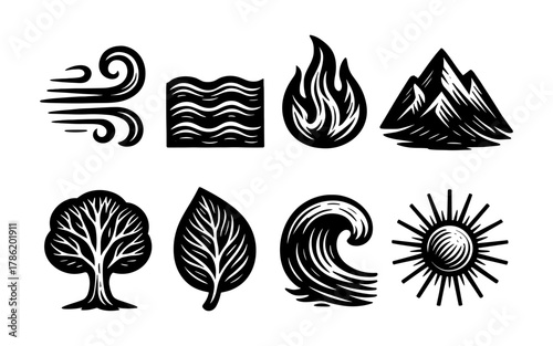 © 4Max, Fototapeta premium Set of hand-drawn element icons: wind, fire, water, earth