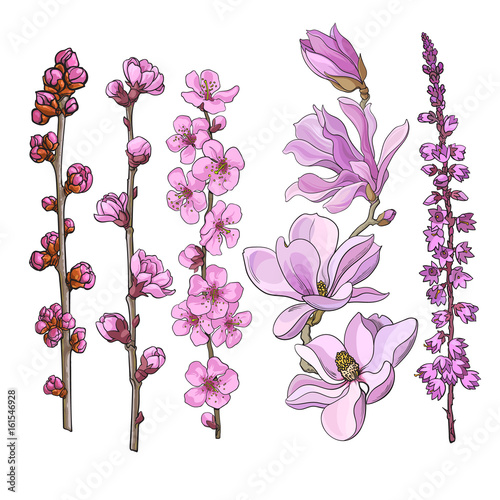 Naklejka premium Set of hand drawn pink flowers - magnolia, apple and cherry blossom, heather, sketch vector illustration isolated on white background. Realistic hand drawing of twigs branches stems with pink flowers