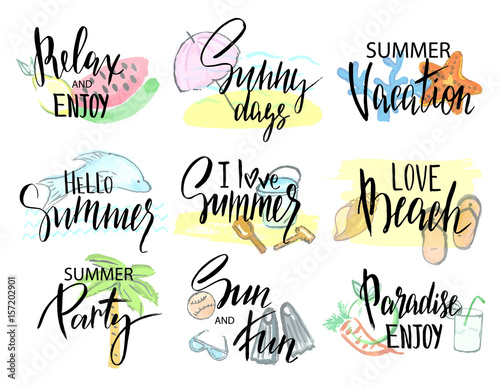 © Liliya, Fototapeta premium Set of hand drawn summer labels, logos, and elements set for summer holiday, beach vacation. Vector illustration.