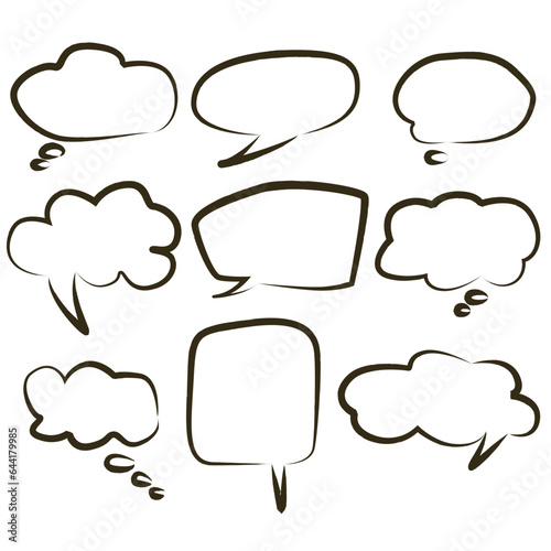 © olianat, Fototapeta premium Set of hand drawn think and talk speech bubbles for message and dialog words. Doodle style comic balloon, cloud, heart shape design elements. Isolated vector.