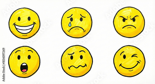 © street sign art, Fototapeta premium Set of hand drawn yellow smiley faces with various emotions