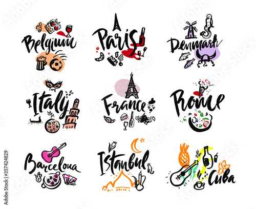 © SVETLANA, Naklejka premium Set of hand written calligraphic lettering European countries names with iconic elements. Isolated objects on white background. Vector illustration for banner, card design, poster, web.