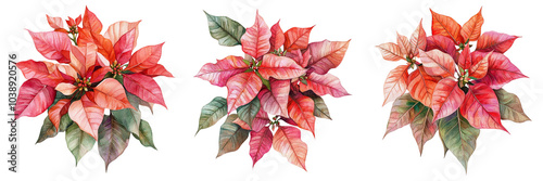 © Liton, Fototapeta premium Set of Holiday-inspired red watercolor poinsettia branch with lush leaves, painted in detailed shades on transparent background. Ai generated
