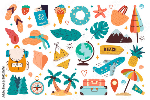 © Mykola Syvak, Naklejka premium Set of icons for summer travel concept. Elements for sea vacation, seaside relax, camp and tourism