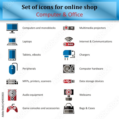 © 13fosgen, Naklejka premium Set of icons of various computer equipment for sections of onlin
